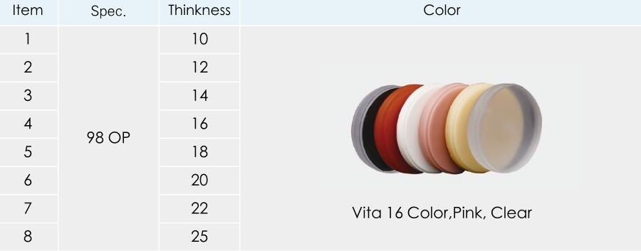 Trouble-free scanning due to the opaque and little reflective surface Yucera PMMA blank provides a variety of compatible PMMA blank with Amann Girrbach, M3/M5, and open cad/cam milling systems of 98mm.